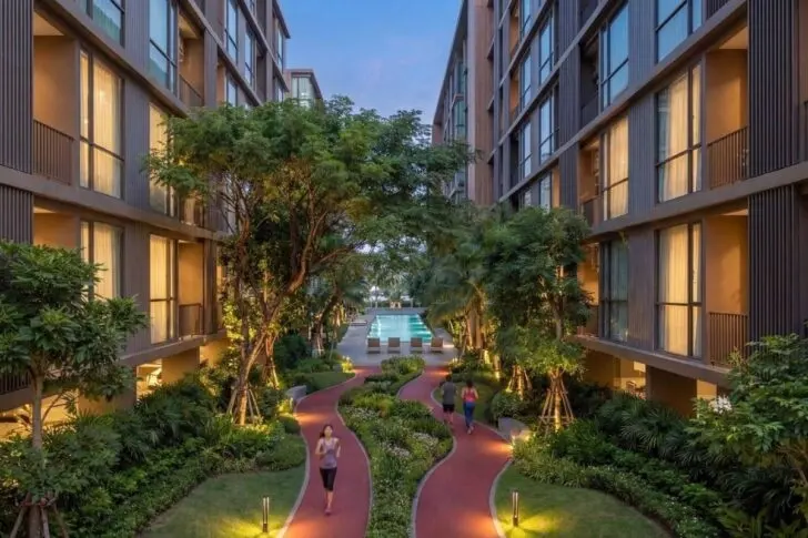 Set on a 6 rai, 3 ngan, 9.4 square wah plot of land, the mixed-use project will comprise 752 units alongside a three-story clubhouse. Units will be sold fully furnished, with sizes ranging from 29 square meters for studio units, 34.5 square meters for one-bedroom layouts, and 50 square meters for two-bedroom configurations. Selling prices are projected between 92,000 and 100,000 baht per square meter. The development embraces what the company calls an “Active Wellness Residence” concept. Facilities are tailored to complement the fitness-oriented environment of Soi Ta-iad. These include three swimming pools, notably a half-Olympic pool suitable for serious training, a sloping jogging track, and a clubhouse featuring a central fitness area and function rooms designed for private classes and group sessions.