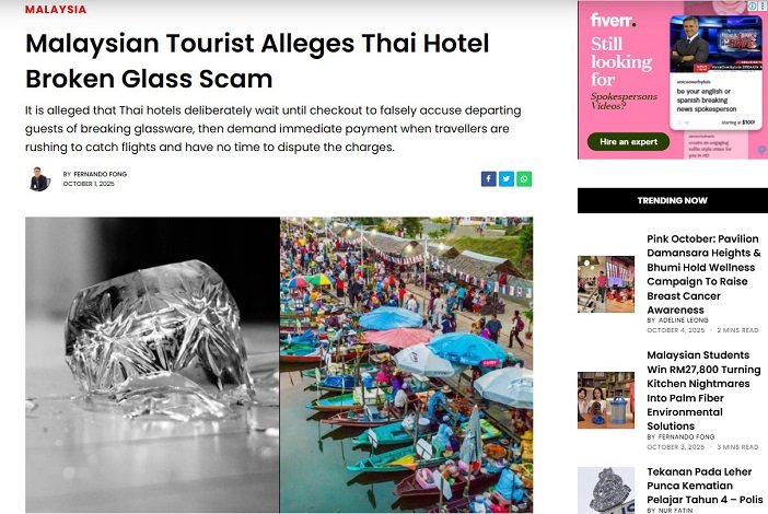 According to this Thailand Hotel News report, the allegations emerged after Nina’s Facebook post accused two unnamed hotels of falsely claiming she broke glassware and charging her 60 baht (about RM7.78) during checkout. She went further, suggesting that Thai hotels routinely exploit departing guests by making fake claims when travellers are pressed for time before flights. However, Thai hotel associations, tourism police, and several Malaysian travel agencies that work directly with hotels in southern Thailand have firmly refuted these claims, stating that no such systematic scam exists.