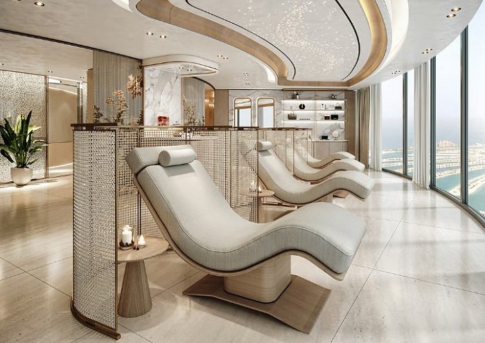 Ciel spa — The waiting deck and beverages station at Ciel Dubai Marina provide guests with a serene pre-treatment experience, blending relaxation with understated luxury.